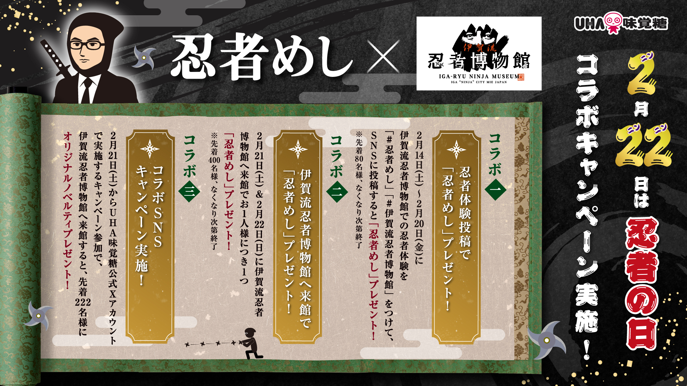 | 2026年02月13日 | 【忍者の日月間イベント】UHA味覚糖《忍者めし》 × 伊賀流忍者博物館 コラボレーション開催 |