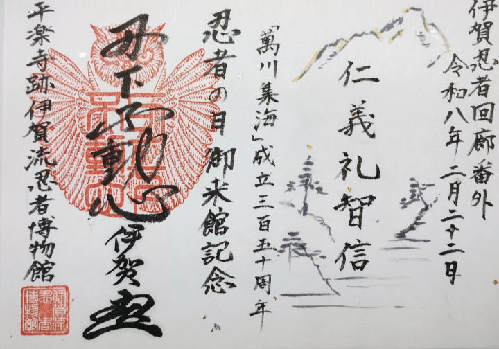 今回の御朱印状には、伊賀の忍び、藤林氏が著したと伝わり、今年で成立350周年を迎える「萬川集海 」中の「仁義礼智信」を記しました。